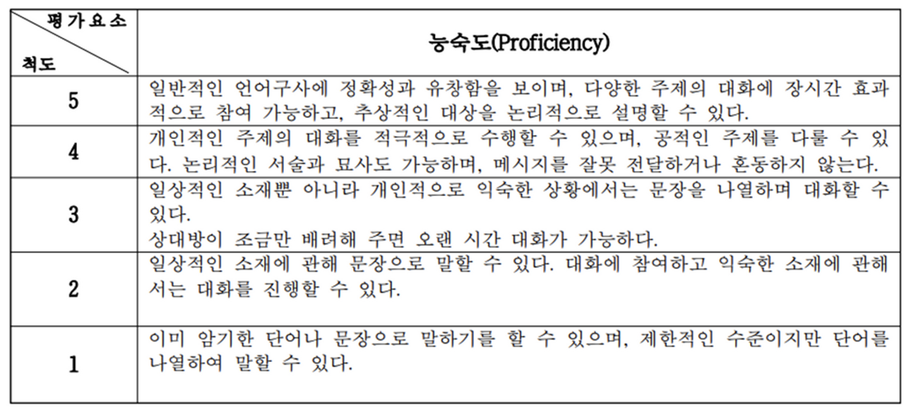 - 숙달도 평가 등급 체계 : 5등급 (1~5)