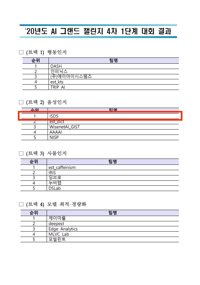 2020 인공지능 그랜드 챌린지 1차 대회 음성인지 분야 1위 입상