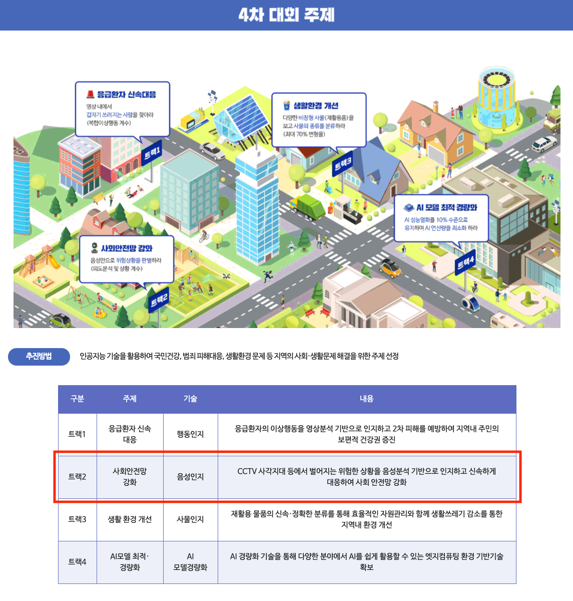‘인공지능 기술을 활용하여 다양한 지역문제를 해결하라’는 주제로 진행되는 이번 ‘2020 인공지능 그랜드 챌린지’ 대회는 인공지능 기술을 활용하여 각종 응급상황(행동인지), 폭력상황(음성인지), 생활폐기물 분류(사물인지), 인공지능 최적·경량화를 통한 전력소비량 감소 등 4개 트랙으로 ’22년까지 3년간 총 4단계로 진행되며 인공지능기술을 통해 편리하고 안전한 생활환경 조성을 목표로 추진된다.