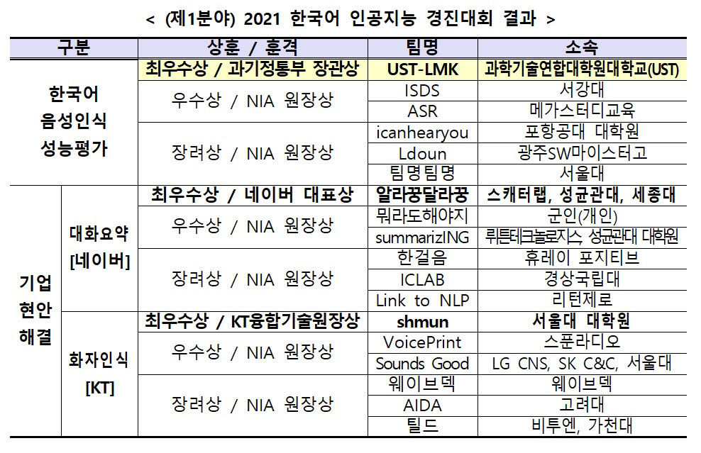 문제해결형(제1분야) 대회에서는 '한국어 음성인식 성능평가' 부문에서 가장 우수한 성적을 기록한 'UST-LMK' 팀이 과기정통부 장관상을 수상했다.
